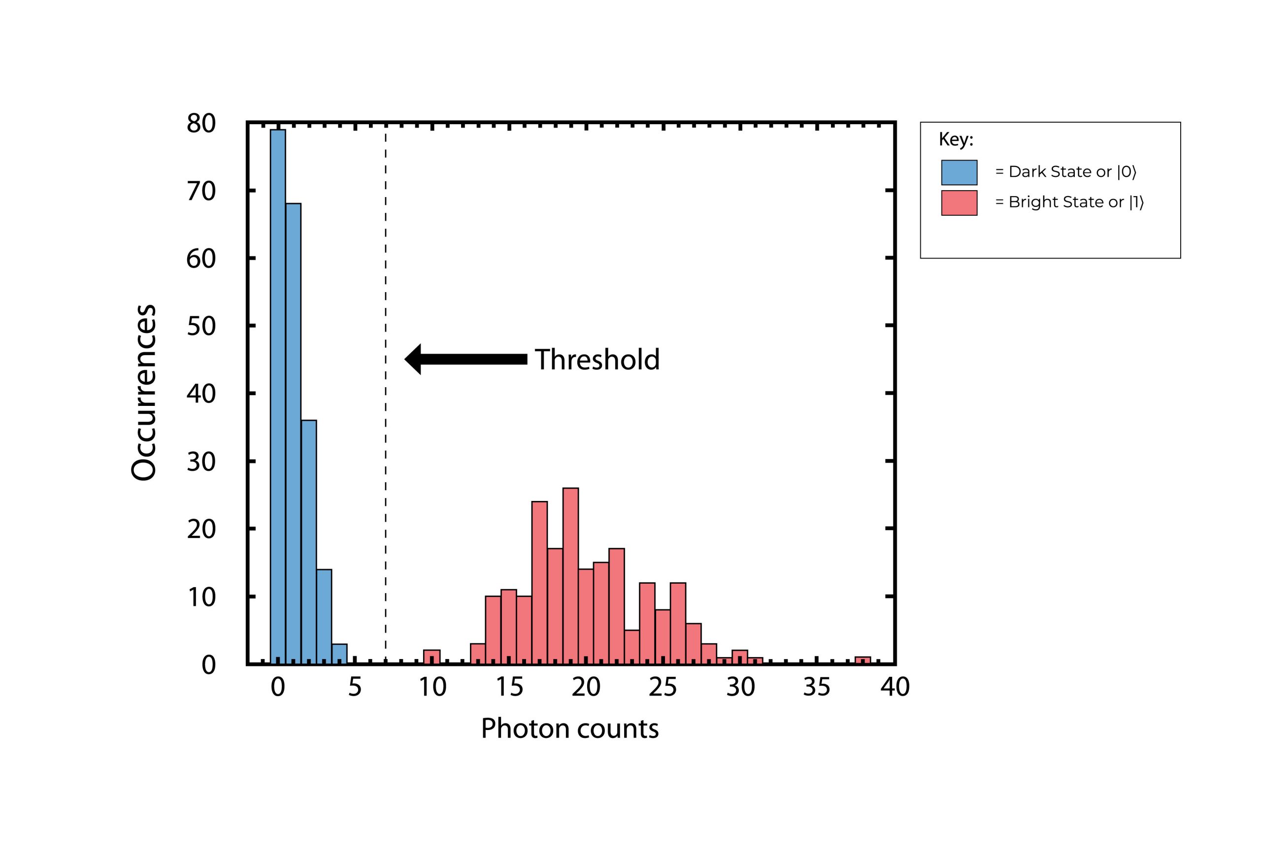 Neutral atom state detection is very similar to trapped ion state detection, where a histogram is constructed over a measurement time, on the order of tens of milliseconds, to distinguish between two states using a threshold derived from the photon counts collected [8].
