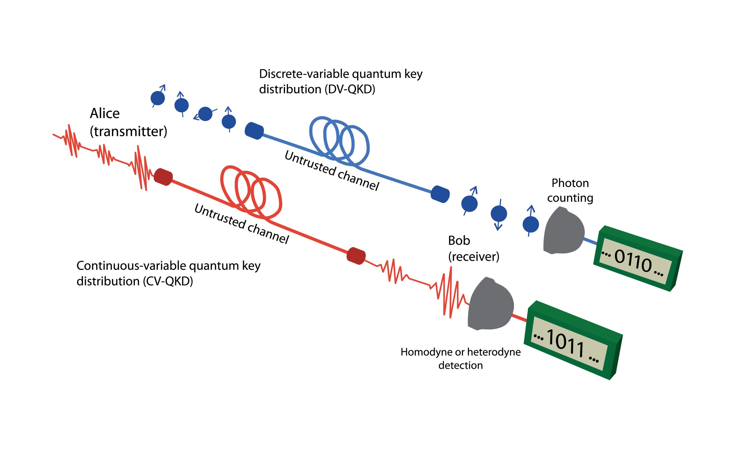 Figure 5. Illustration of two different QKD schemes: discrete-variable QKD (DV-QKD) and continuous-variable QKD (CV-QKD)